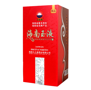 海南玉液酒是海南久之美酒業有限公司為海南本土市場量身定制的優質濃香型白酒,飲后或豪飲后均不上頭、不口干、身體恢復快。2012年被海南省工商局認定為“海南省著名商標”;2013年被海南省名牌產品認定委員會授予為“2013年海南省名牌產品”稱號。該酒經多位國家級和省級評酒專家品評,一致認同海南玉液酒不亞于“五糧液” 。該酒的包裝設計富有強烈時代氣息和濃厚地方特色,創造性地采用了“要想身體好常來海南島”宣傳海南的流行語,溶匯了海南文化元素,適宜接待應酬及做饋贈禮品,是海南...[更多內容]